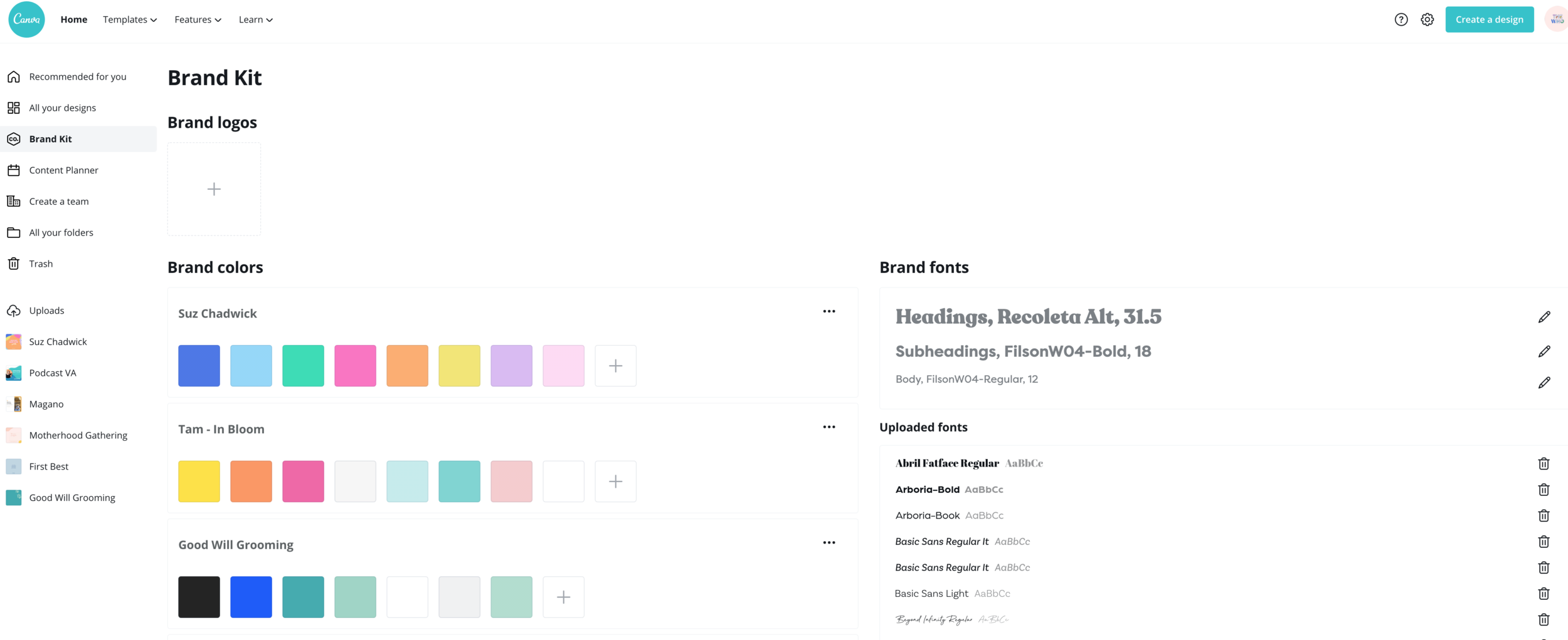 Go into Canva on your desktop computer and go to the Brand Kit. Here you will: